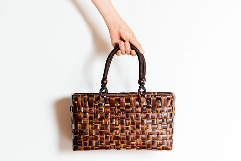 京都の職人が特注で編んだ持ち手もしっかりした作りです。バッグ本体は、山桜の樹皮を薄く削り編み上げ、裏打ちをして補強しております。