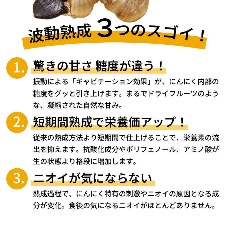 最大の特長は、特許技術「波動熟成製法」です。特殊な振動を与えながら熟成させることで、にんにく特有のニオイを抑え、ドライフルーツのような驚きの甘さを実現しました。短期間熟成によりS-アリルシステインなどの栄養素も逃さず凝縮。原料には青森県産「福地ホワイト六片」と京都・綾部市の自社農園産を厳選し、完全無添加で仕上げた、毎日続けられる美味しさです。