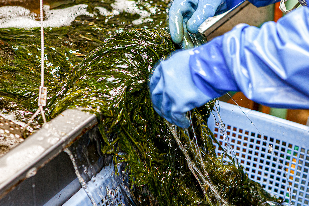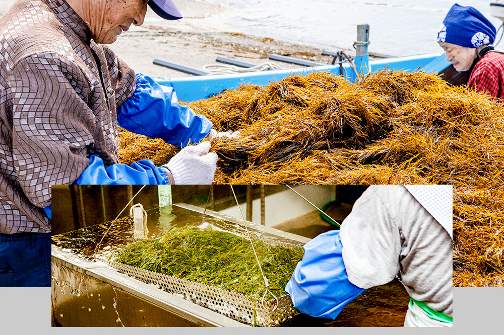 あかもくという名前のとおり、生の状態では赤褐色で、湯掻くことで鮮やかな緑色になり、細かく刻むことで強い粘りを引き出します。
