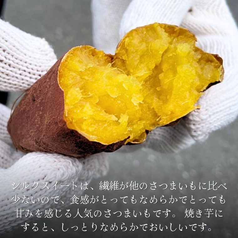シルクスイートは、繊維が他のさつまいもに比べ少ないので、食感がとってもなめらかでとっても甘みを感じる人気のさつまいもです。