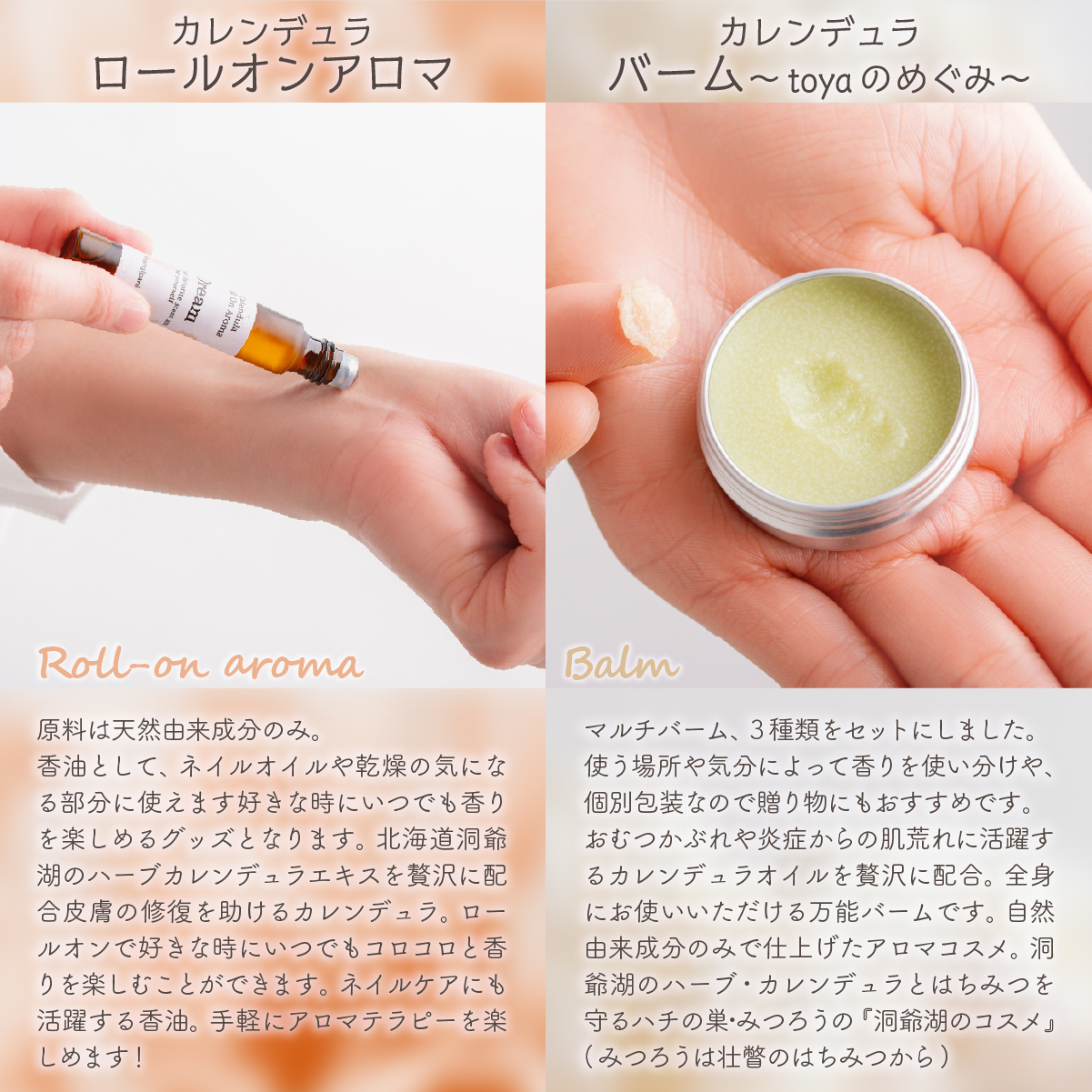 北海道洞爺湖のハーブカレンデュラエキスを贅沢に配合皮膚の修復を助けるカレンデュラ。ロールオンで好きな時にいつでもコロコロと香りを楽しむことができます。