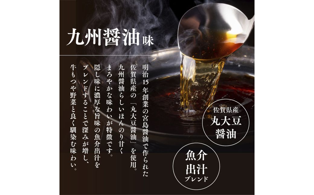 ・明治15年創業の宮島醤油で作られた佐賀県産の「丸大豆醤油」を使用しております。九州醤油らしいほんのり甘くまろやかな味わいが特徴です。