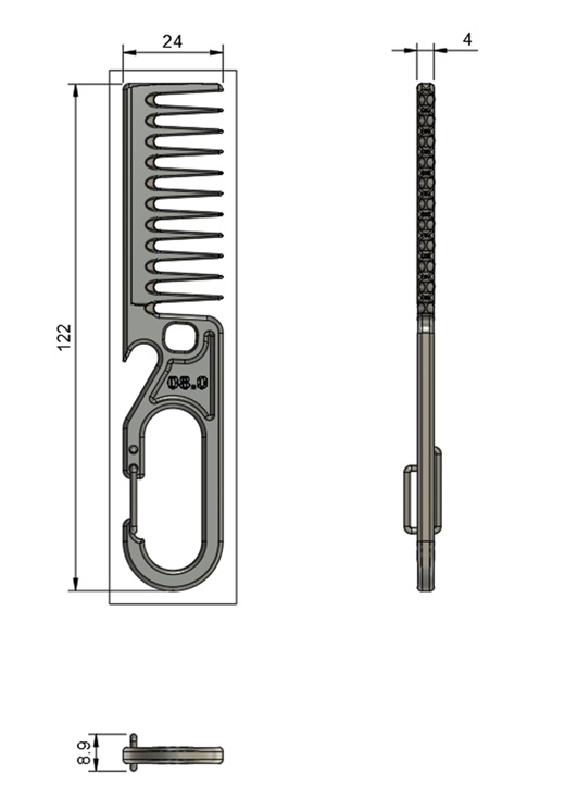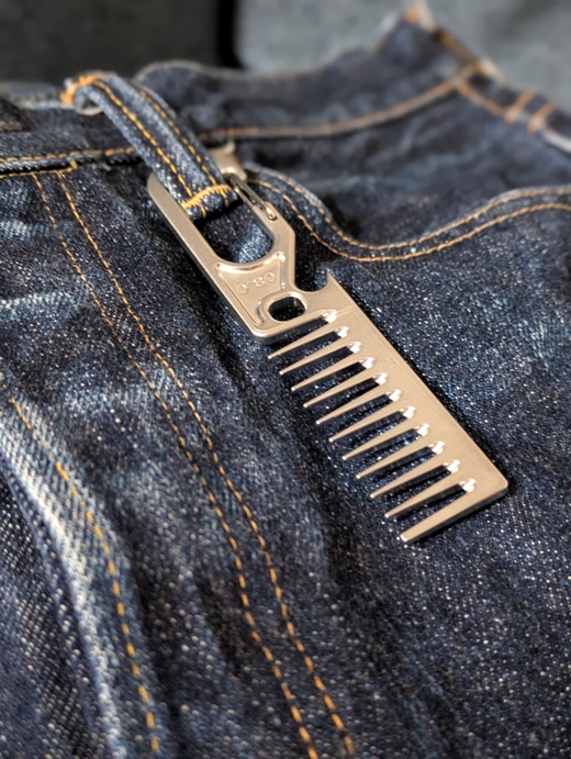 重さわずか50gの超軽量設計でありながら、「ヘアコーム」・「栓抜き」・「カラビナ」の3つの機能をスマートに凝縮した、革新的な多機能ギア。ポケットやバッグにすっきりと収まるコンパクトな手のひらサイズ(全長122mm、幅24mm、厚さ最大8.9mm)で、いつでもどこへでも気軽に持ち運びいただけます。