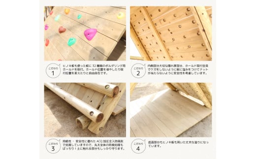 緩やかな傾斜は、小さな子供たちまでも安全にボルダリングの楽しさを体験でき、遊びながら集中力を鍛えます。まるで秘密基地のようなフォルムは、ときには追いかけっこのコースとなりかくれんぼの舞台にもなりそう。