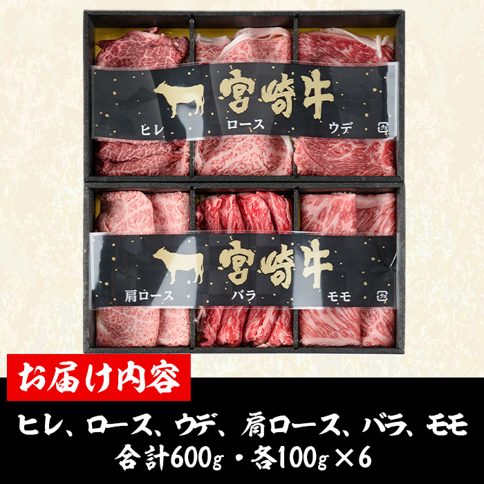 宮崎牛肩ローススライス:100g<br>宮崎牛バラスライス:100g<br>宮崎牛モモスライス:100g<br>宮崎牛ウデスライス:100g<br>宮崎牛ローススライス:100g<br>宮崎牛ヒレスライス:100g