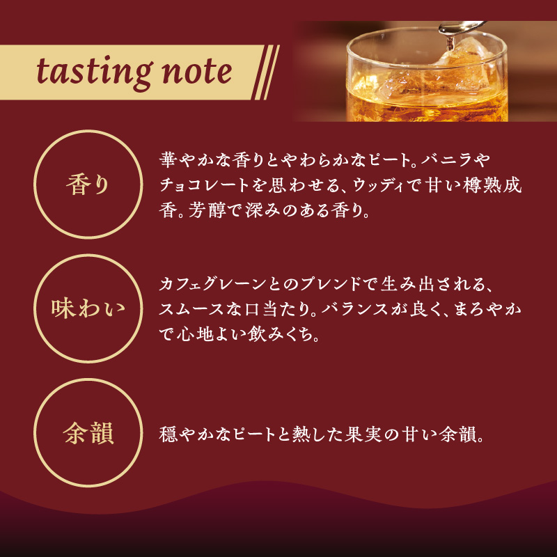 カフェグレーンとのブレンドによるスムースな口当たり、バランスの良いまろやかな味わいが特長です。