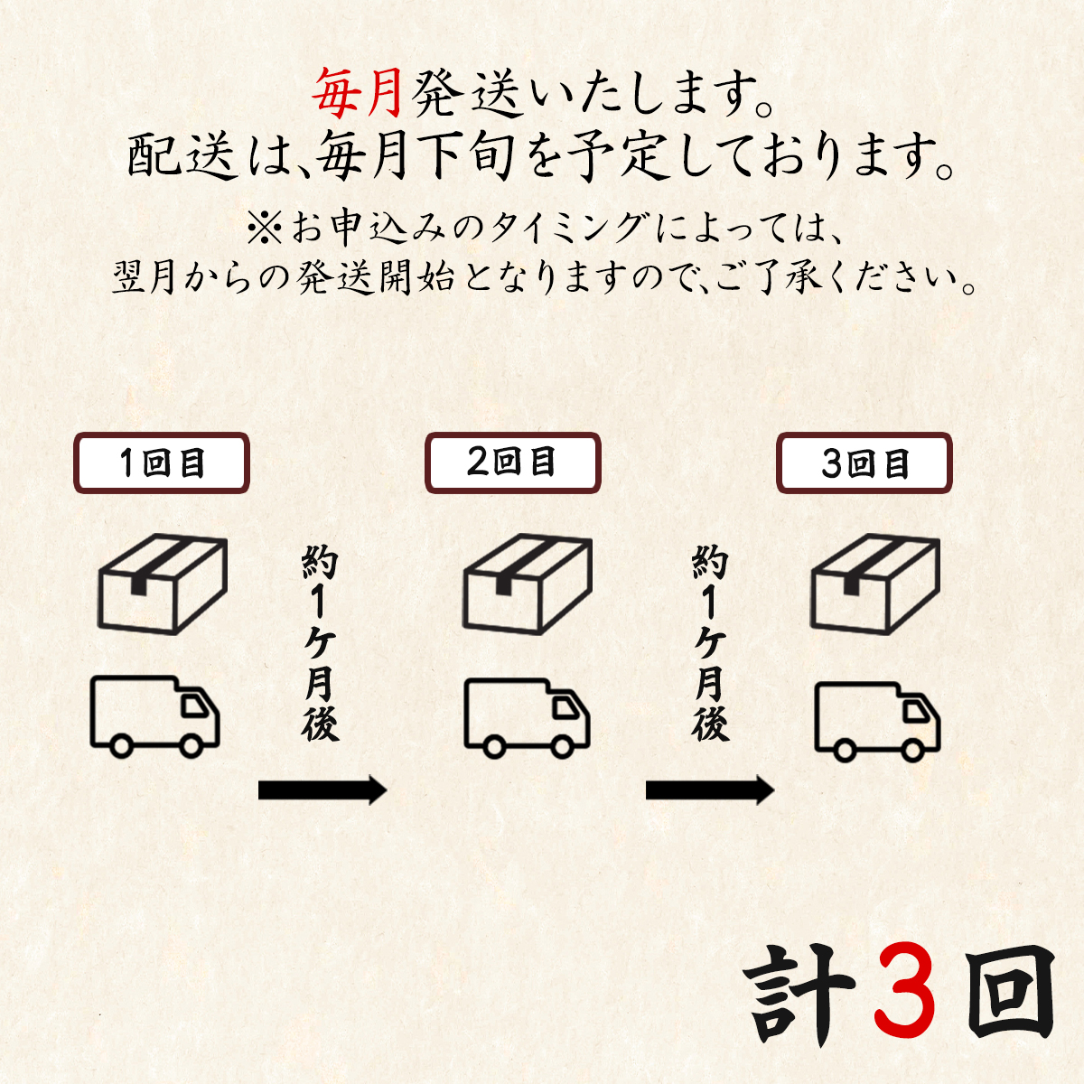 - お届け予定:ご入金確認後、翌月下旬より毎月下旬に発送予定です。