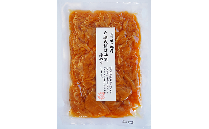 (1)戸隠大根しょうゆ漬薄切り100g(だいこん(戸隠おろし)、漬け原材料〔しょうゆ、砂糖、醸造酢、食塩、日本酒、酵母エキス、はちみつ〕)