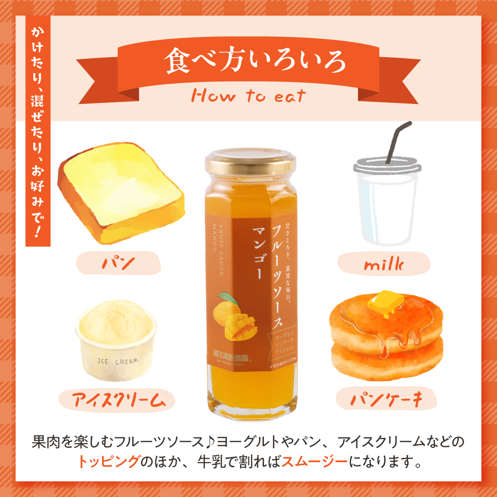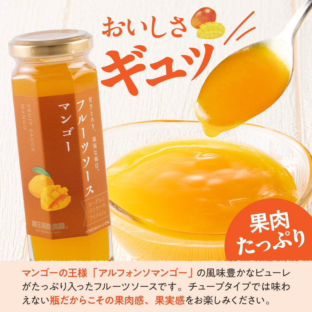 マンゴーの王様「アルフォンソマンゴー」の風味豊かなピューレがたっぷり入ったフルーツソースです。チューブタイプでは味わえない瓶だからこその果肉感、果実感をお楽しみください。