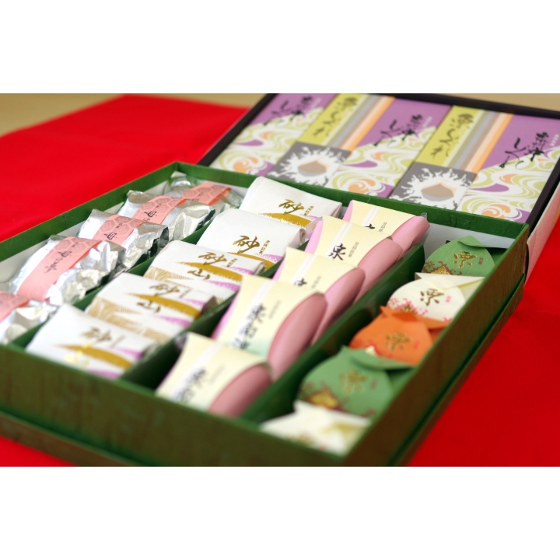 ■原材料 :小豆(北海道産)、白小豆、栗、上新粉、砂糖、卵、小麦粉、寒梅粉、みりん、バター、粉乳、ごま、ピーナッツ