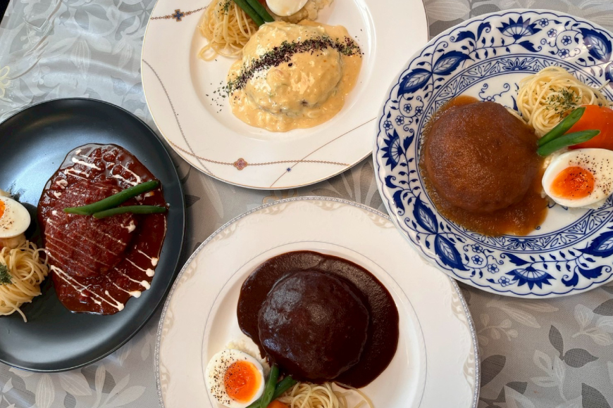 国産牛100%で造るハンバーグは、デミグラス・トマト煮込み・タルタル・和風大根おろしの4種類からお楽しみいただけます。