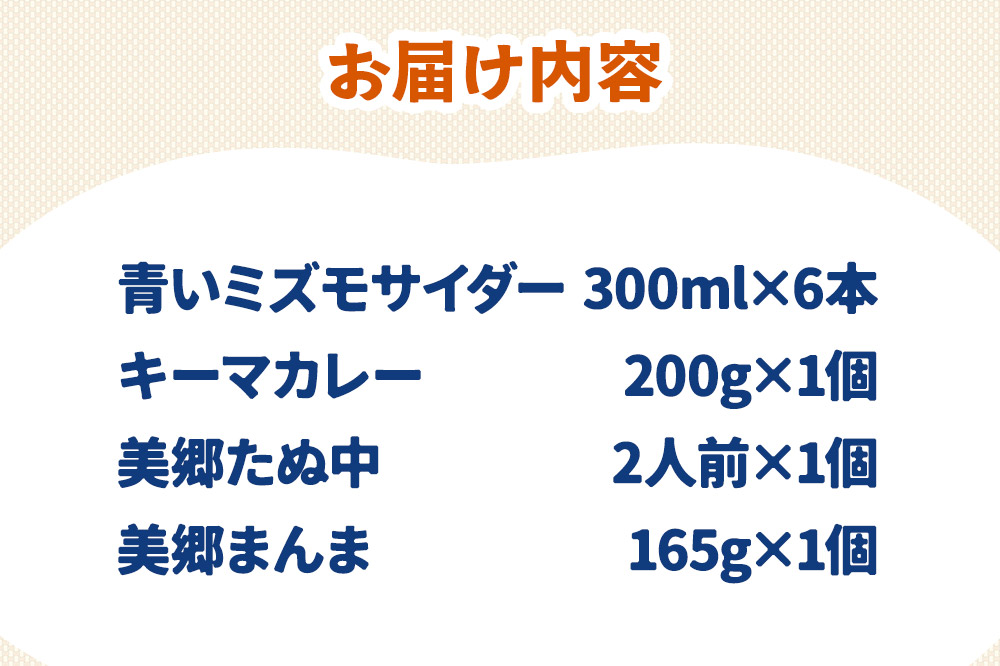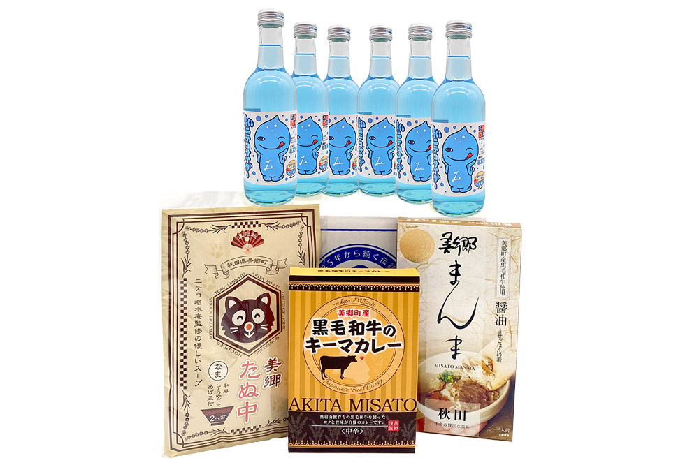 秋田県美郷町の豊かな水源と良質な水質の水を使用した青いミズモサイダーと、美郷ご当地グルメ「美郷たぬ中」と「美郷黒毛和牛のキーマカレー」と「美郷まんま」をセットにしてみました。