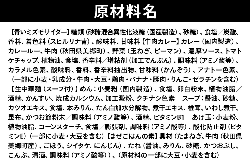 ニテコサイダー 青いミズモサイダー ご当地 サイダー 炭酸飲料 炭酸水 カレー キーマカレー レトルト 中華麺 ラーメン まぜごはん セット 秋田県 美郷町 (260403170133)