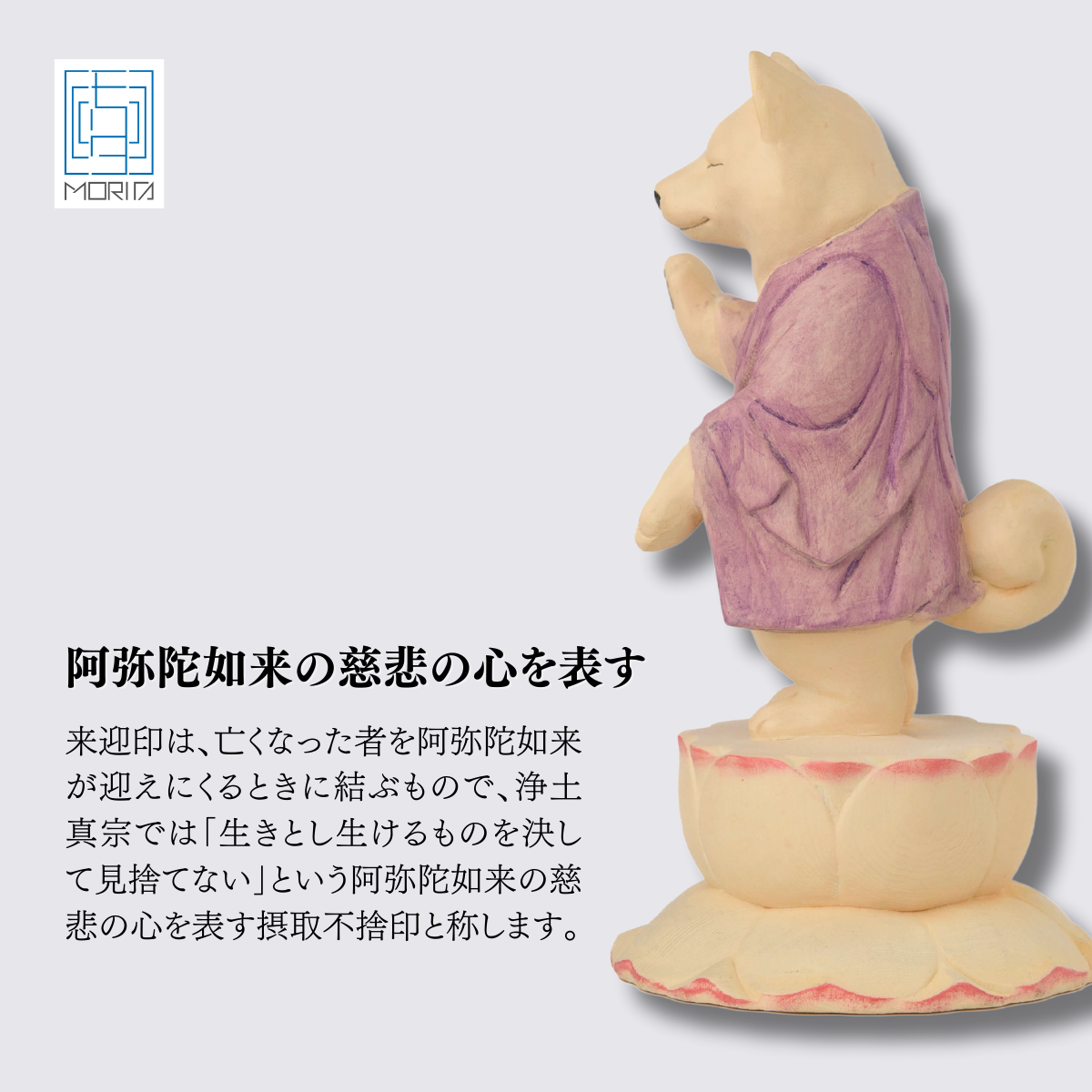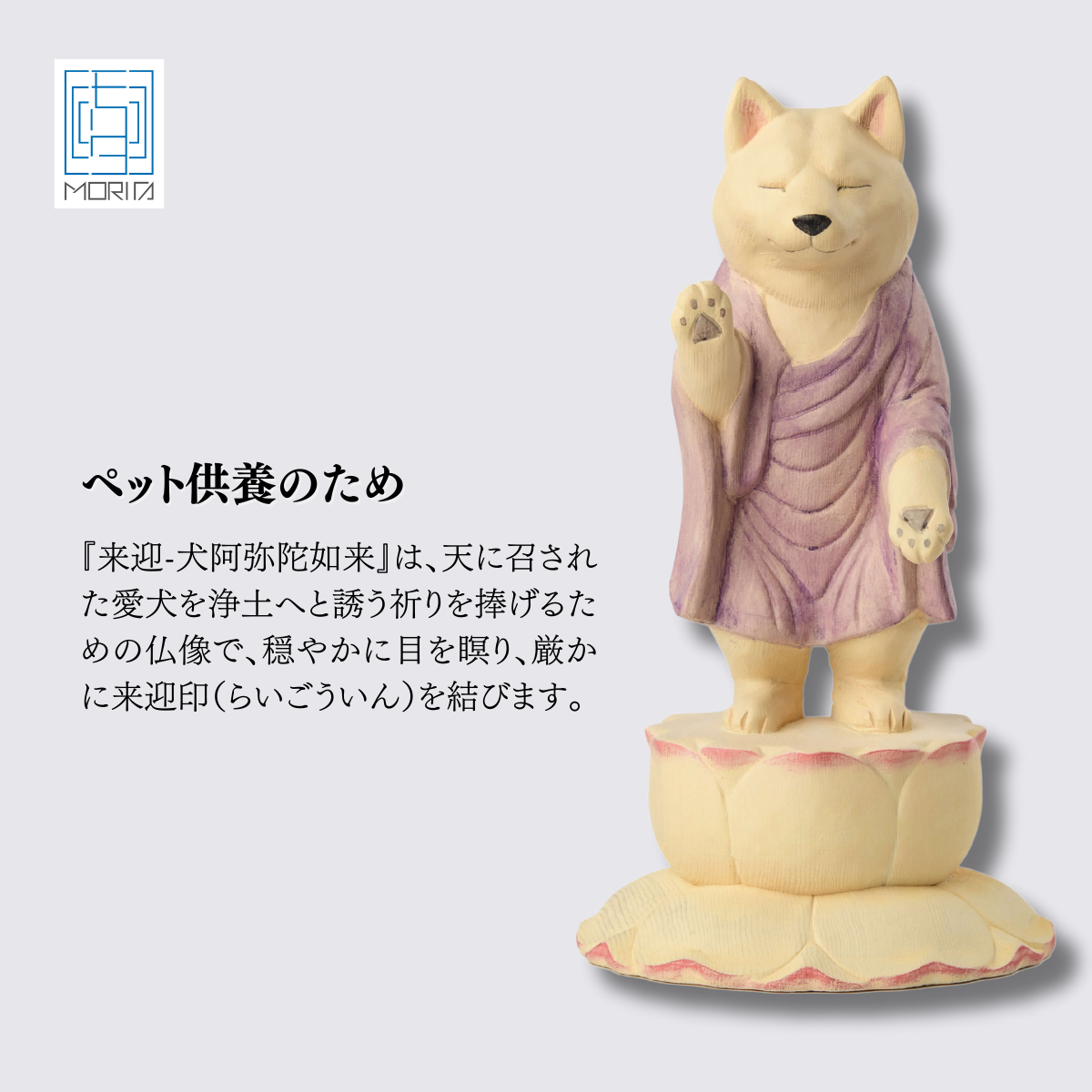 『来迎-犬阿弥陀如来』は、天に召された愛犬を浄土へと誘う祈りを捧げるための仏像で、穏やかに目を瞑り、厳かに来迎印(らいごういん)を結びます。