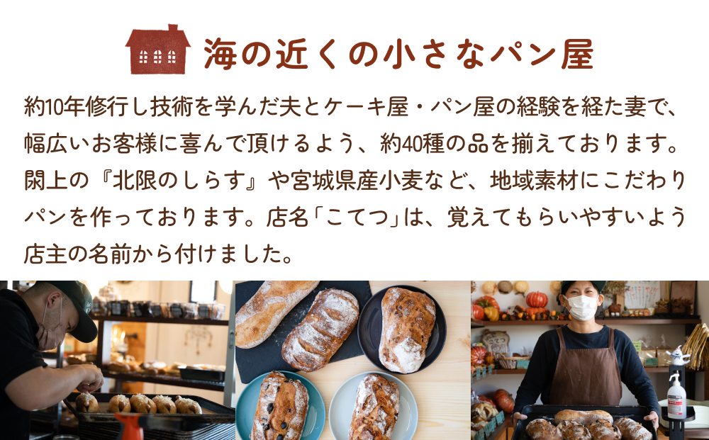 約10年間、宮城のパン屋で修行し技術を学んだ夫と、ケーキ屋・パン屋の経験を経た妻で、幅広い寄付者様に喜んだ頂けるようにと、約40種類の品をそろえております。子供がまだ小さいこともあり、自宅兼店舗にして育児と両立したいと考えていたところ、ご縁があって閖上の地に開業することとなりました。閖上で捕れた『北限のしらす』や宮城県産小麦を使うなど、地域のものにこだわりパンを作っております。店名である「こてつ」というのは、店主の名前から取っており覚えてもらいやすいように付けました。