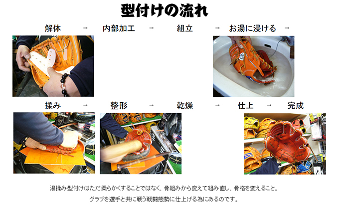 湯もみ型付けと言われるグラブの型付けは、グラブ型付け名人「江頭重利」氏の愛弟子堀内氏に教わった技術で、今までのグラブ作りの固定概念を覆した型付けを提供いたします。