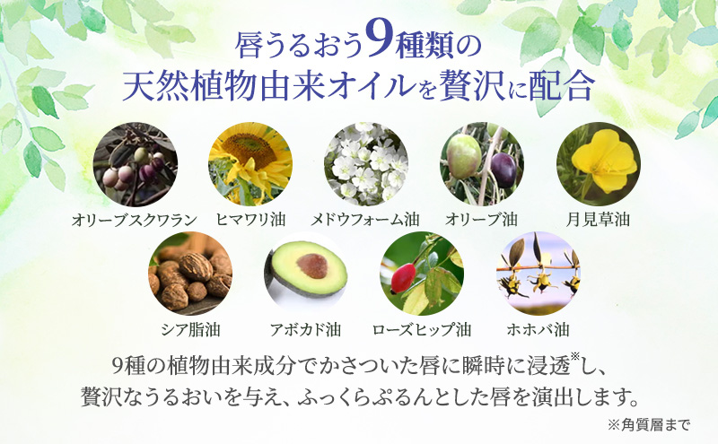 9種の植物由来成分でかさついた唇に瞬時に浸透※し、贅沢なうるおいを与え、ふっくらぷるんとした唇を演出します。
