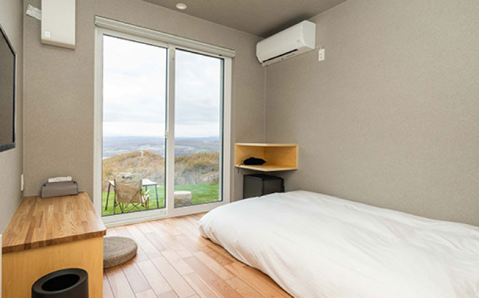 Wi-Fi(無料)、室内にはカウンターテーブルがあり、書類などを広げて作業することができます。客室から直接百名山雌阿寒岳を眺めながらデスクワークができるガーデンスペースに出ることもできます。