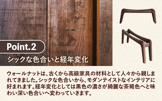 厚みのあるウォールナット無垢材を使用しつつも、曲線を主としたラインは見た目も滑らかで柔らかい印象にし、無垢木材の表情が活きるようディティールにこだわり仕上げています。無垢材ならではの質感と触り心地も楽しんでいただけます。