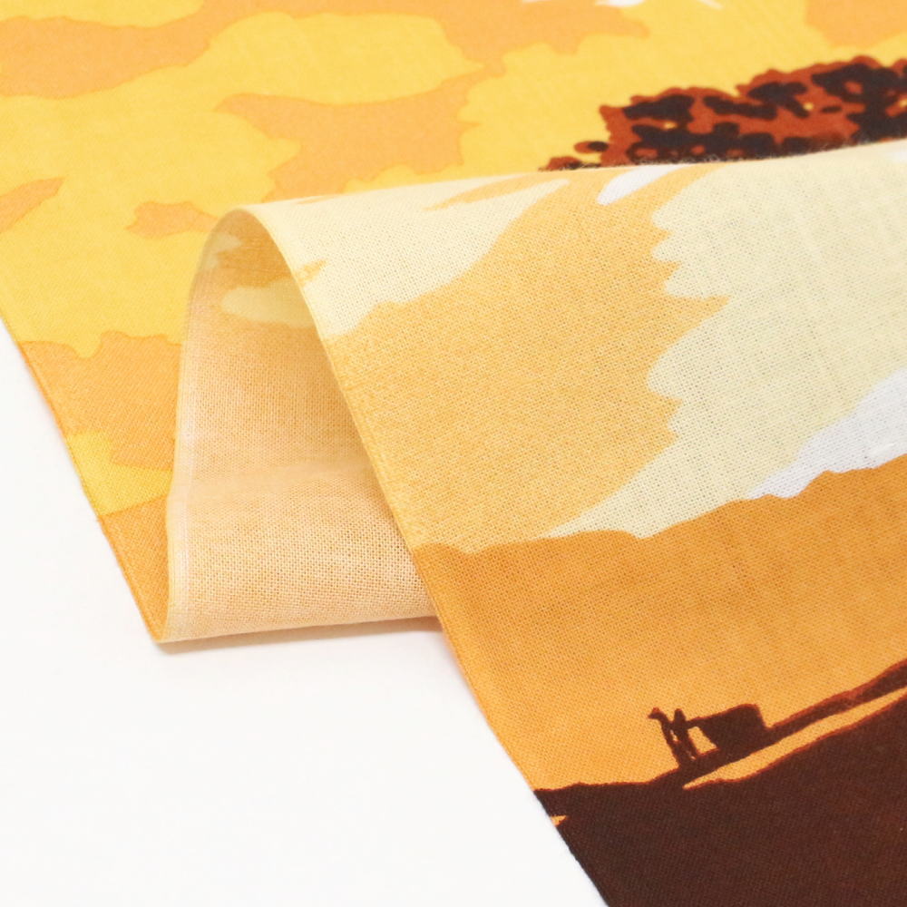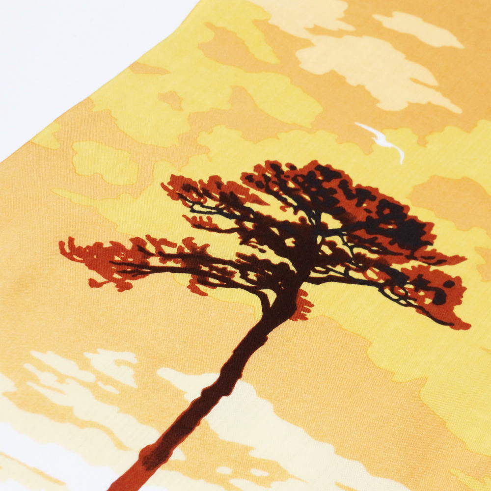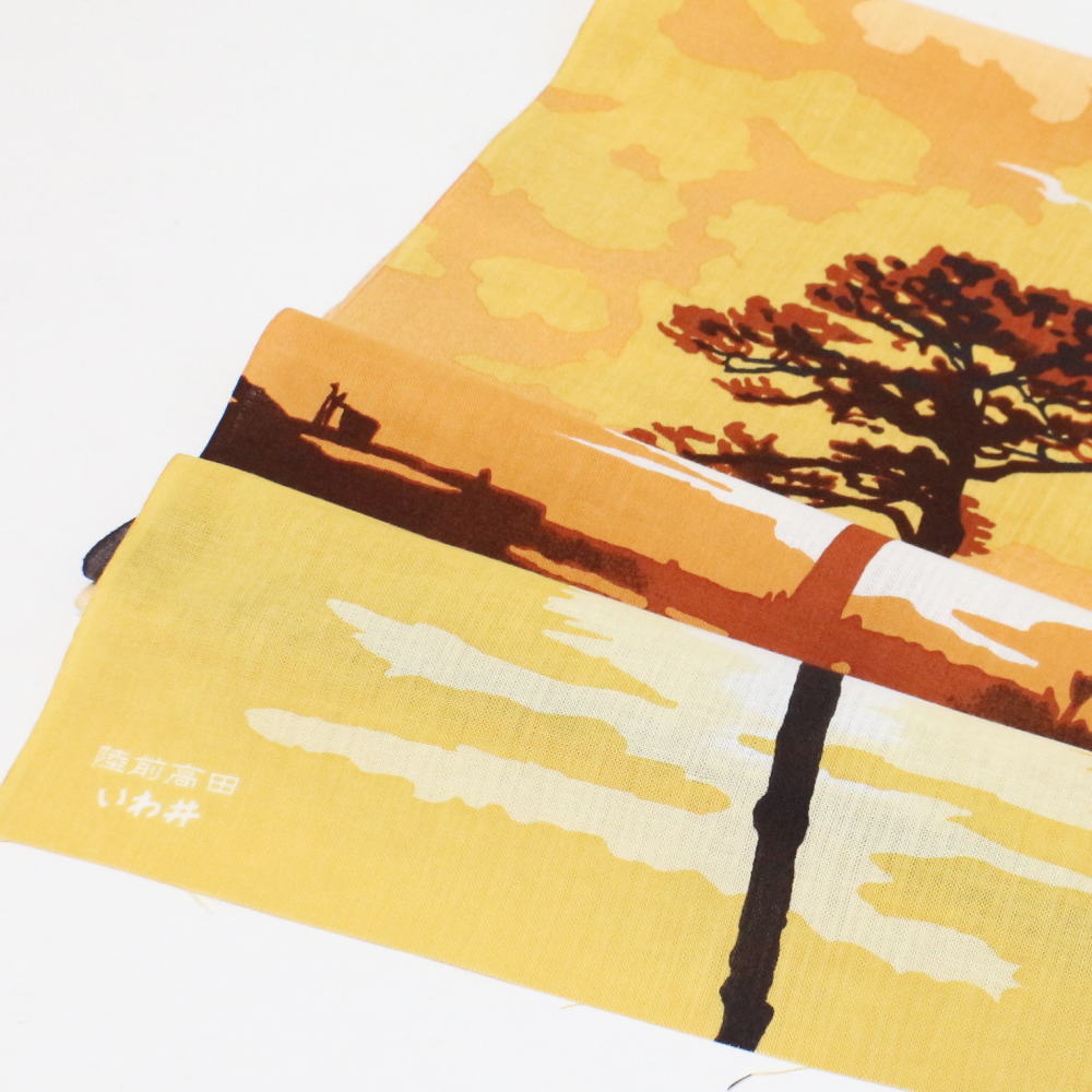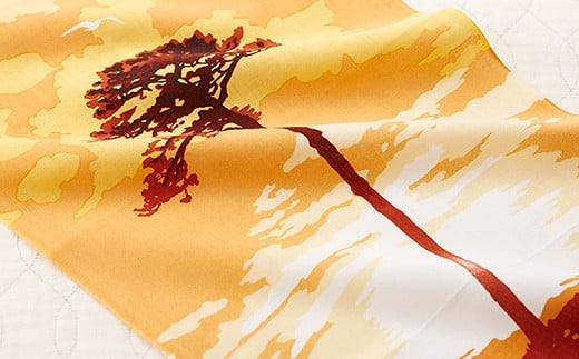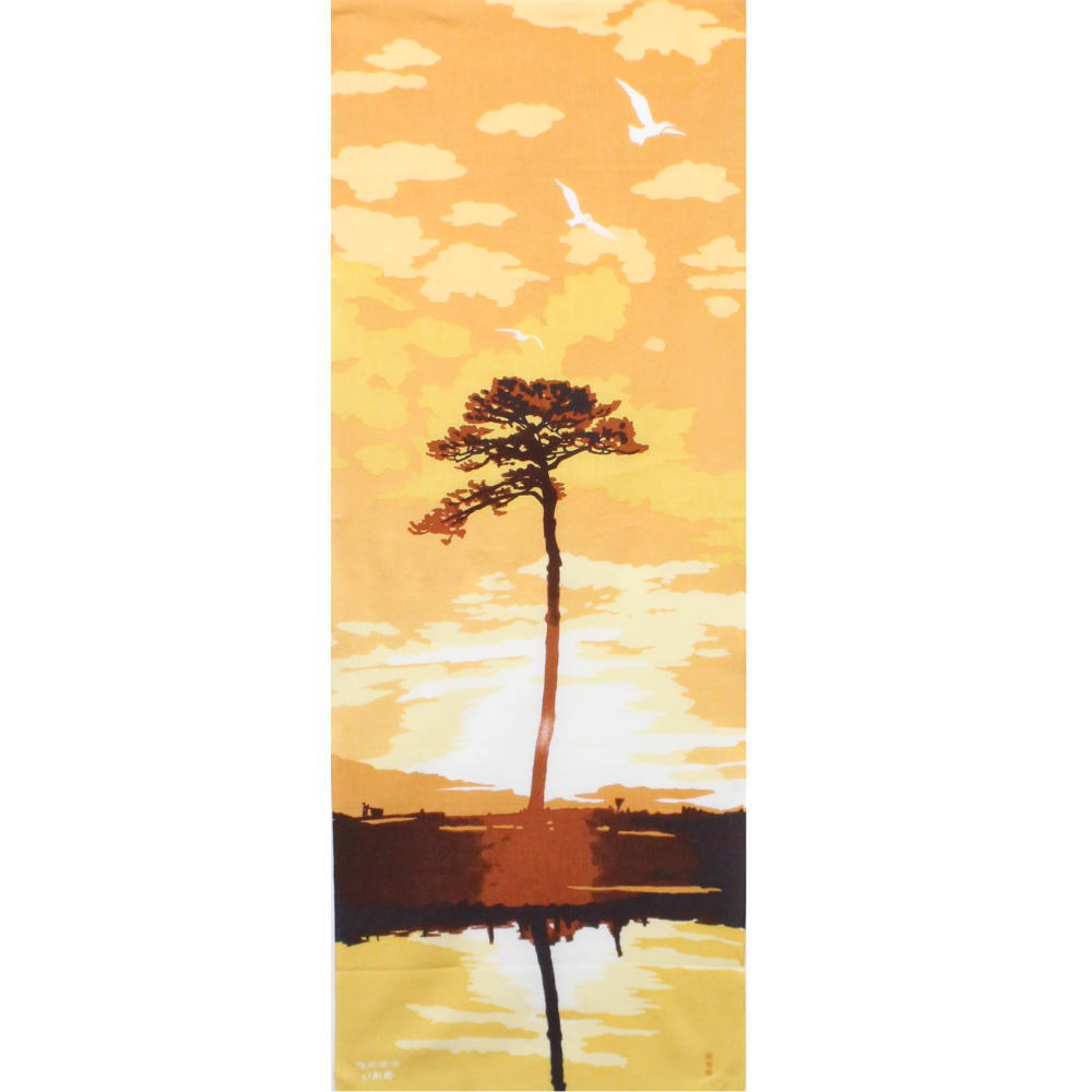 絵手ぬぐいの柄は、奇跡の一本松最後の夜明けの姿です。地元新聞社の記者が、切り倒される日の夜明けに撮った写真をもとに、空を飛ぶカモメ、水面にうつる松の姿をデザインしました。横浜 濱文様(株式会社ケイス)の協力のもと、何度も何度もデザイン・色合いや色数などを調整して、ようやく横浜伝統の型染め手法である捺染(なっせん)にて染上げ、寂しいながらも希望を感じる凛とした夜明けの立ち姿をオリジナルとして製作しました。