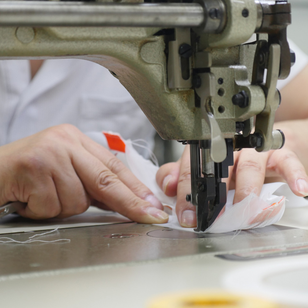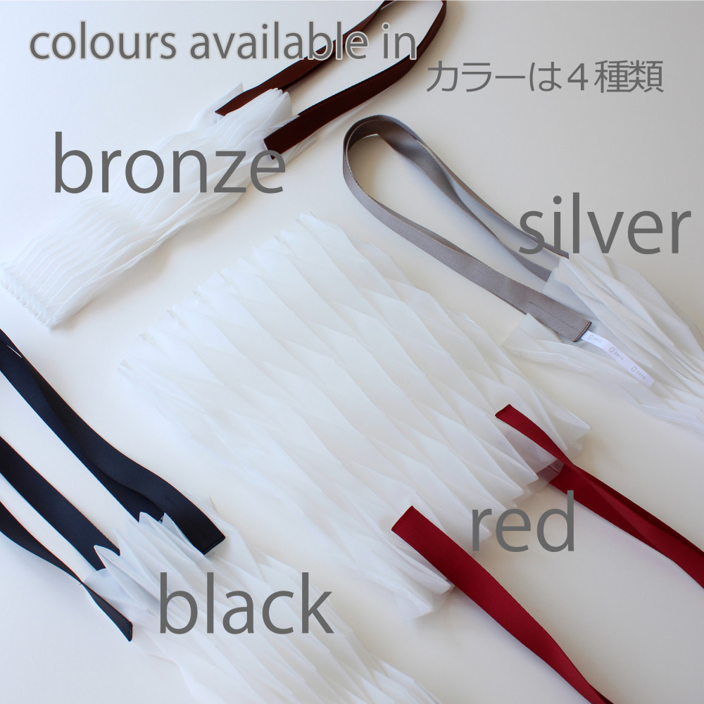 当返礼品は、自動車塗装用の手袋に使用される高密度ポリエステルメッシュを採用。厚さわずか90ミクロンという極薄素材を、専用ミシンと熟練の職人技で一枚ずつ丁寧に縫製しています。プリーツ加工を施し、超軽量ながら高い耐久性を実現。上品な透け感と独特の手触りをお楽しみいただけます。