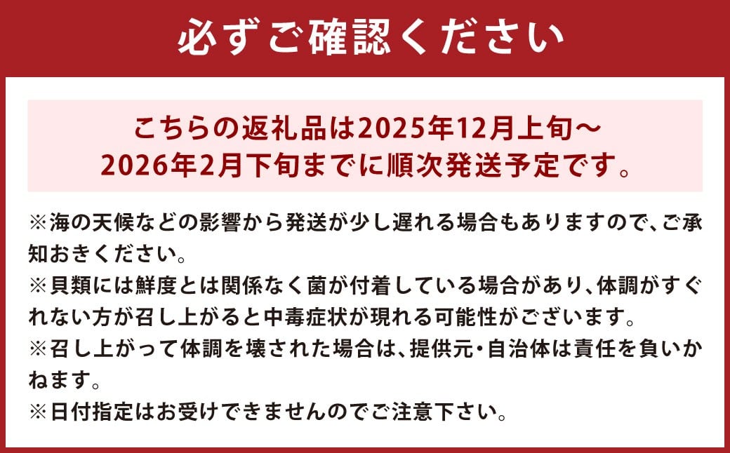 ※貝類には鮮度とは関係なく菌が付着している場合があり、体調がすぐれない方が召し上がると中毒症状が現れる可能性がございます。