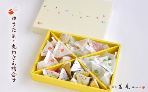 四国地産の5つの果実を使った、愛らしい錦玉菓子「ゆうたま」と、和三盆糖をたっぷりと使った焼竈菓子「丸わさん」のお詰め合わせ。