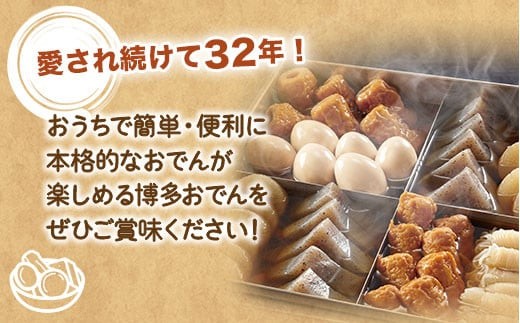 かつおベースのだしにアゴだしを加えた本格スープで味付けし、九州ではベーシックな6種類の具材(糸こんにゃく・ちくわ・玉子・ごぼう巻・三角こんにゃく・大根)が入ったレトルトおでんです。