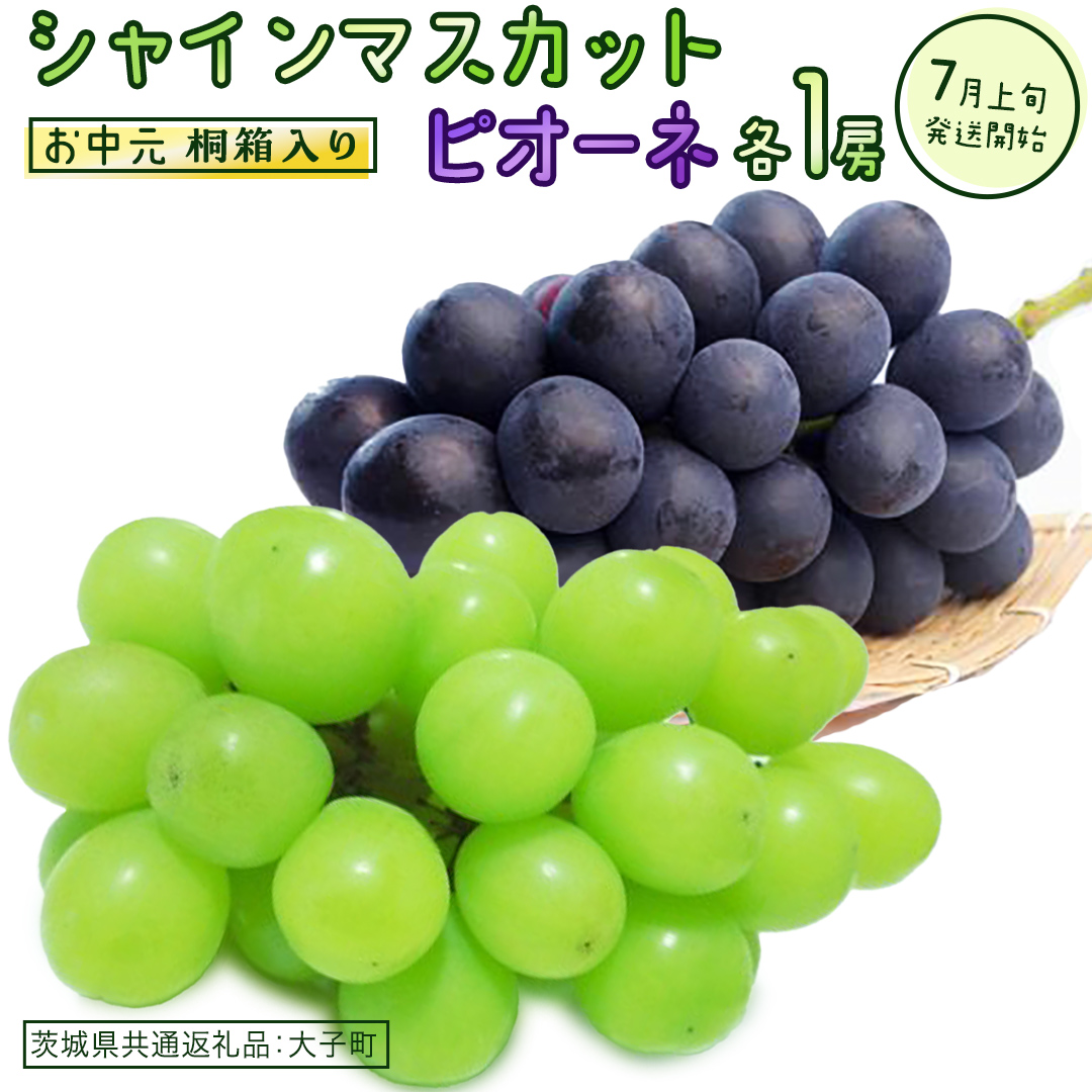 「シャインマスカット&ピオーネ(各1房)桐箱入りセット」は、夏の贈り物にふさわしい、贅沢な味わいと上品な佇まいが魅力です。