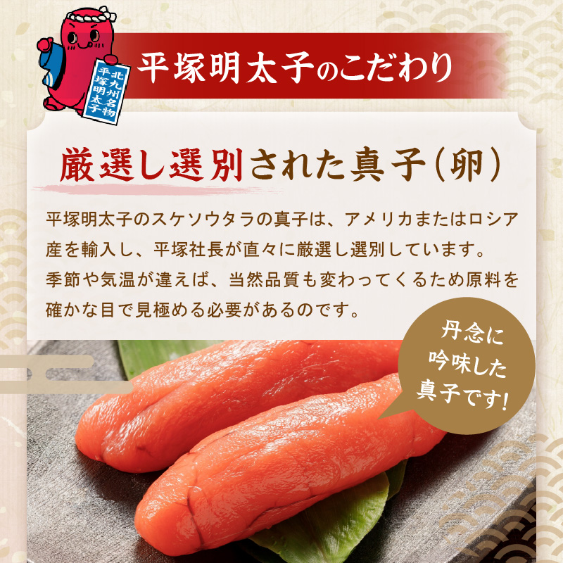 平塚“秘伝”の味がぎゅっと詰まった自信の辛子明太子です。
