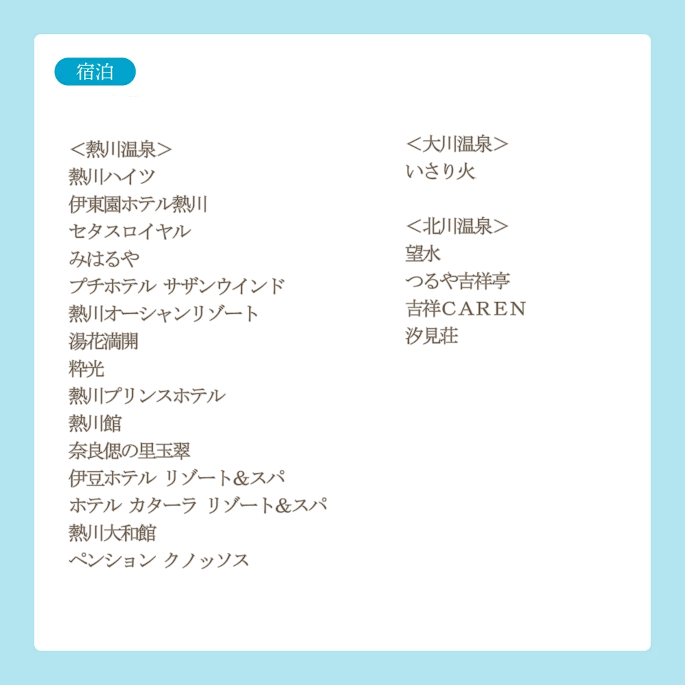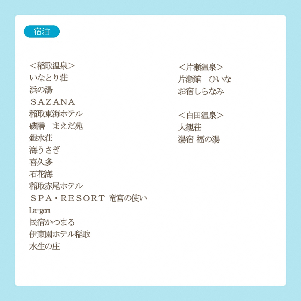関連キーワード: 宿泊 旅行 伊豆 東伊豆 温泉 旅館 ホテル 宿泊券 旅行券 稲取温泉 熱川温泉 北川温泉 白田温泉 片瀬温泉 大川温泉 レジャー ギフト 体験 チケット