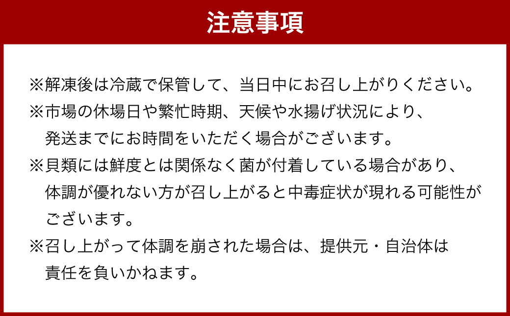 ※貝類には鮮度とは関係なく菌が付着している場合があり、体調が優れない方が召し上がると中毒症状が現れる可能性がございます。