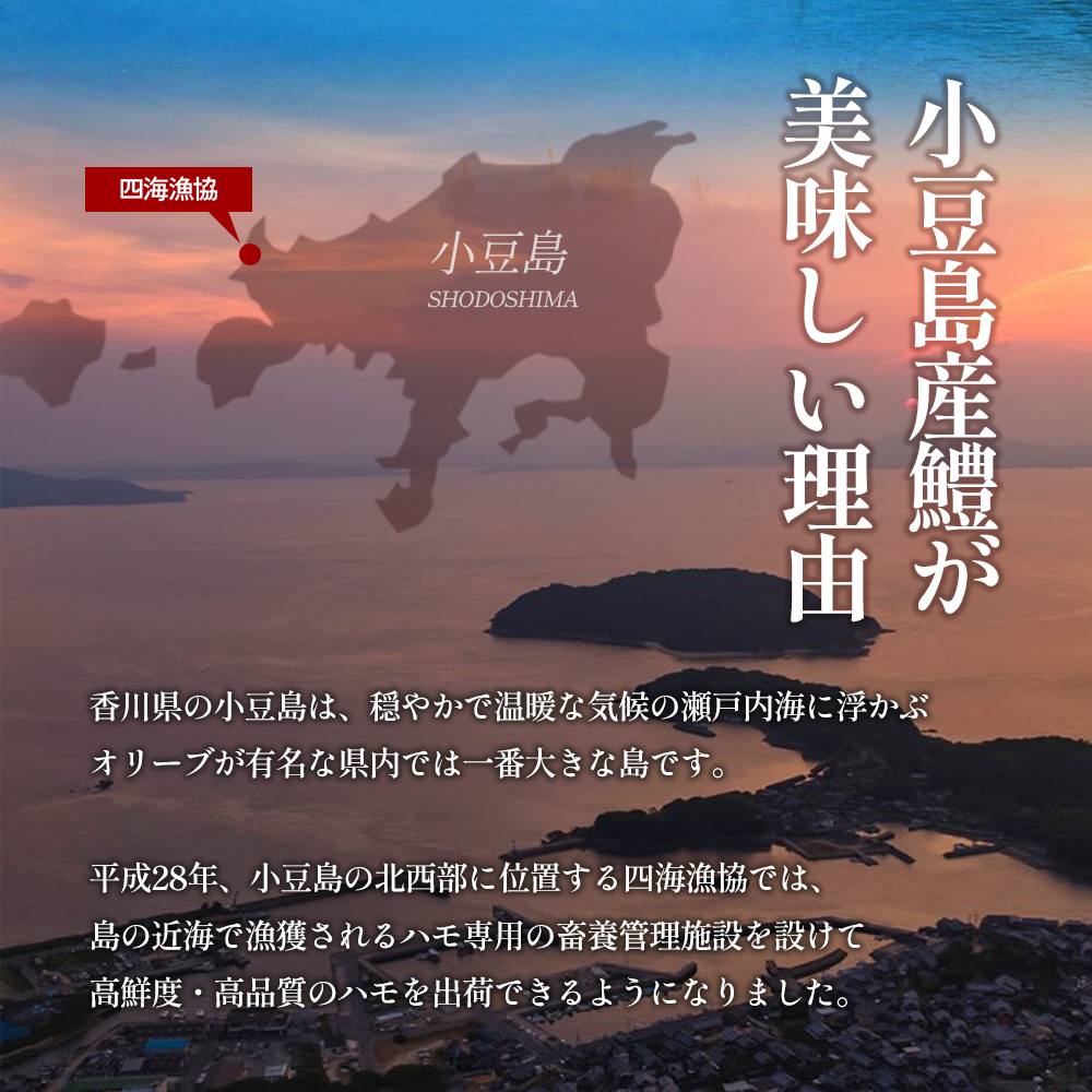 明治時代に日本で唯一根付けに成功した「オリーブ」、江戸時代から受け継がれる「醤油」、日本の三大生産地にもなっている「そうめん」、日本一の生産量を誇る「ごま油」、小豆島産オリーブのしぼり果実を配合した特別な餌『オリーブ飼料』で育てられた「小豆島オリーブ牛」、全国発信を目指す小豆島のブランド鱧 「小豆島 島鱧(しょうどしま しまはも)」など、豊かな自然で育まれたおいしいものがいっぱい。