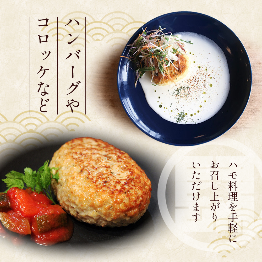 つみれにしてお鍋に。また、ハンバーグやコロッケなど、ハモ料理を手軽にお召し上がりいただけます。