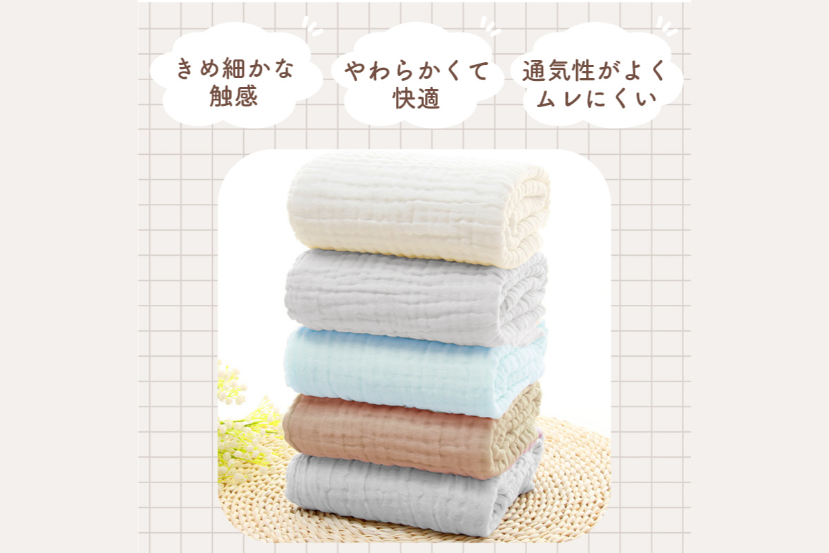 お風呂あがりやお昼寝時はもちろん、よだれ拭き・授乳・おくるみ代わりなど、さまざまなシーンで活躍。