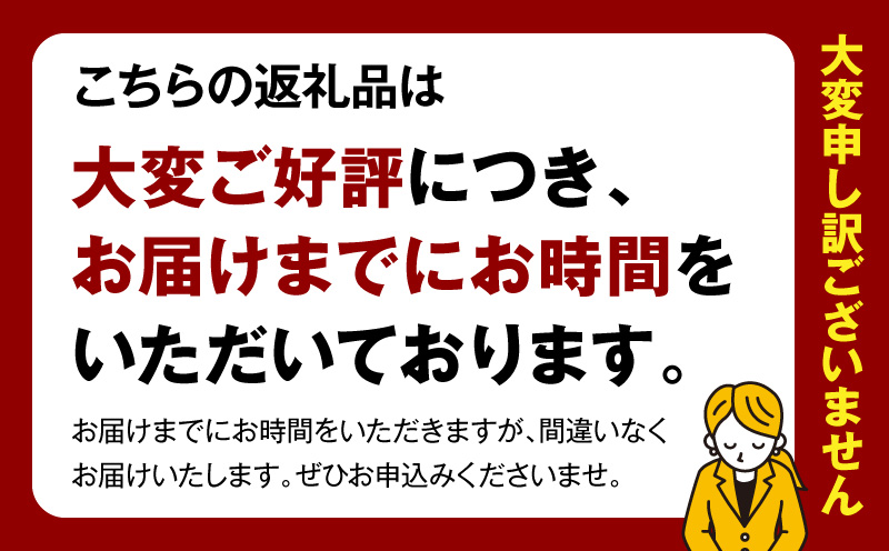 ・お礼品の在庫状況により、お礼品ページ内表記のお届け時期以上に時間を頂戴する場合がございますのでご理解の程宜しくお願い致します。