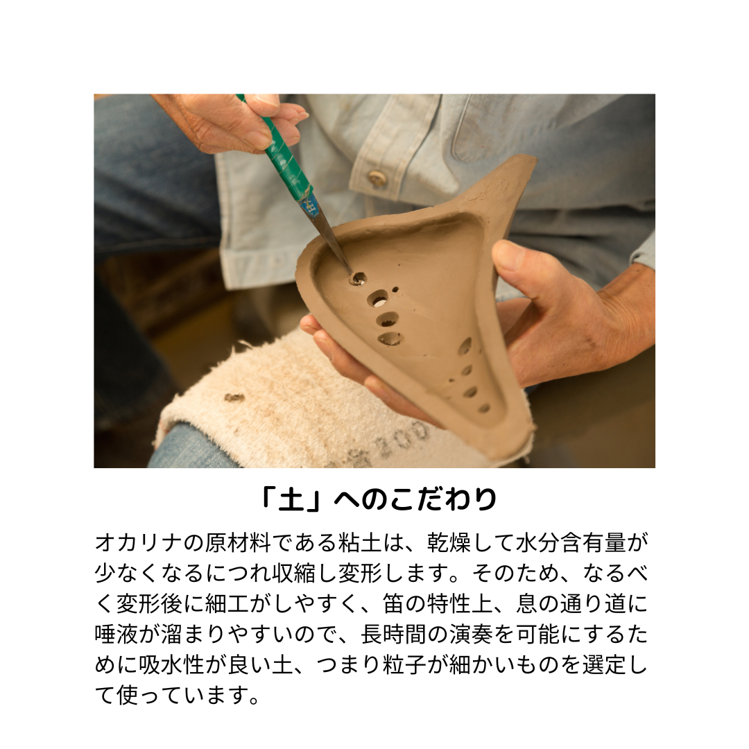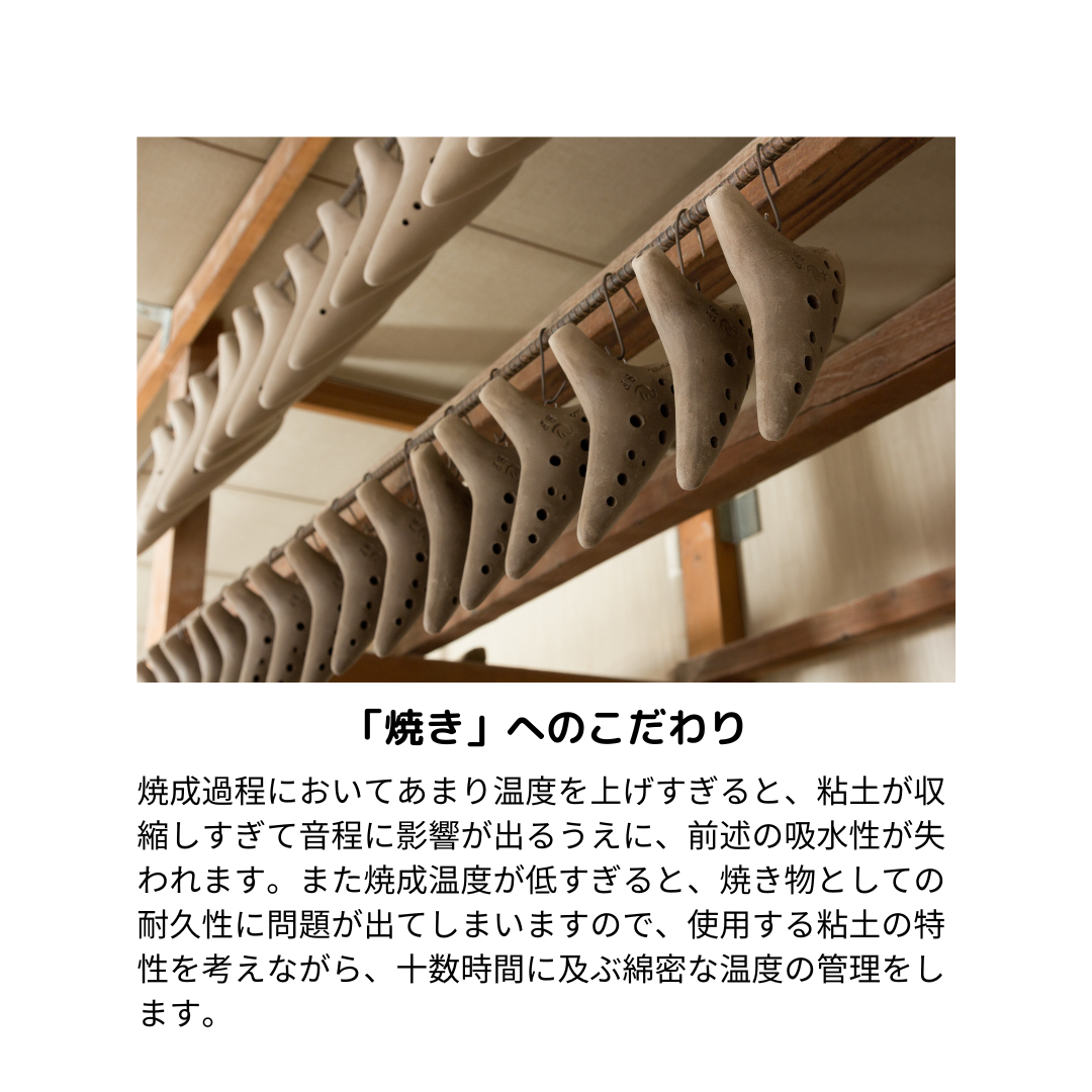 楽器であるオカリナづくりには、他の焼き物製作とは異なる温度や湿度の管理や、綿密な焼成温度の管理が必要なため、現在はオカリナづくり専門の工房となっております。