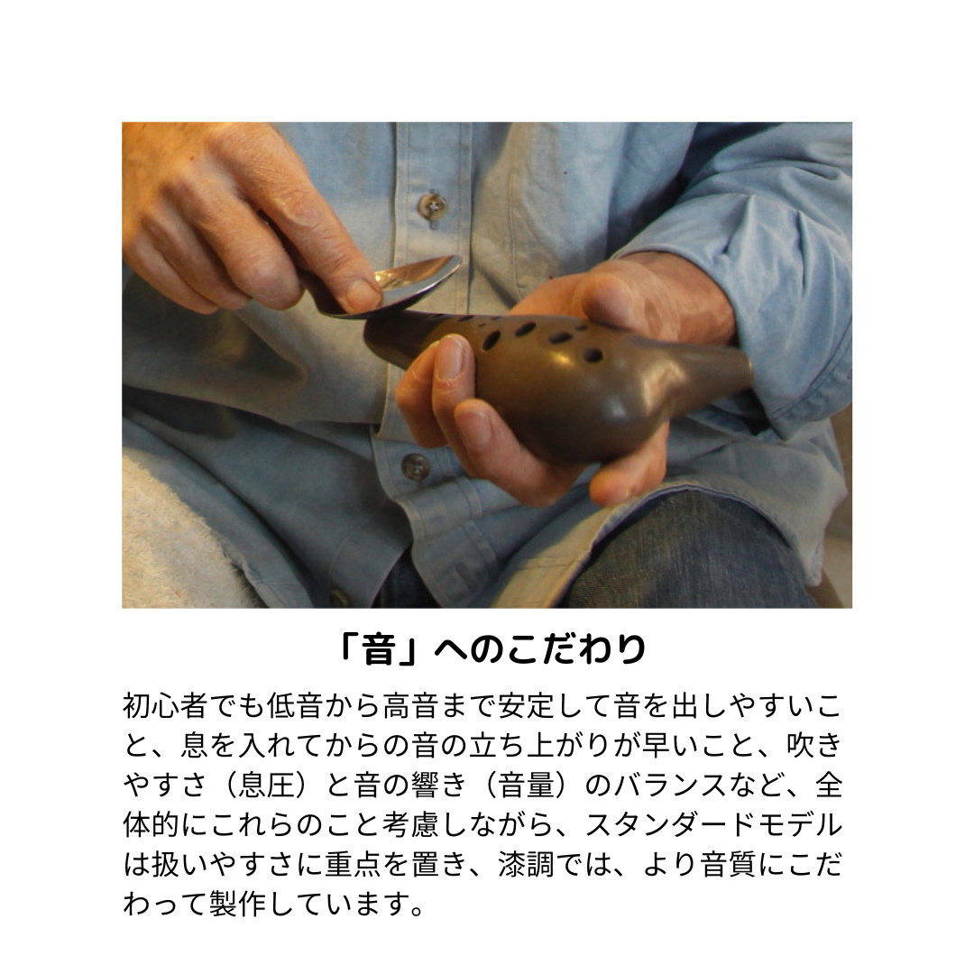 POPOLPオカリナは、低音から高音まで安定して音が出やすいことや、音の立ち上がりの良さ、吹きやすさと音の響きのバランスなどを考えて製作しています。