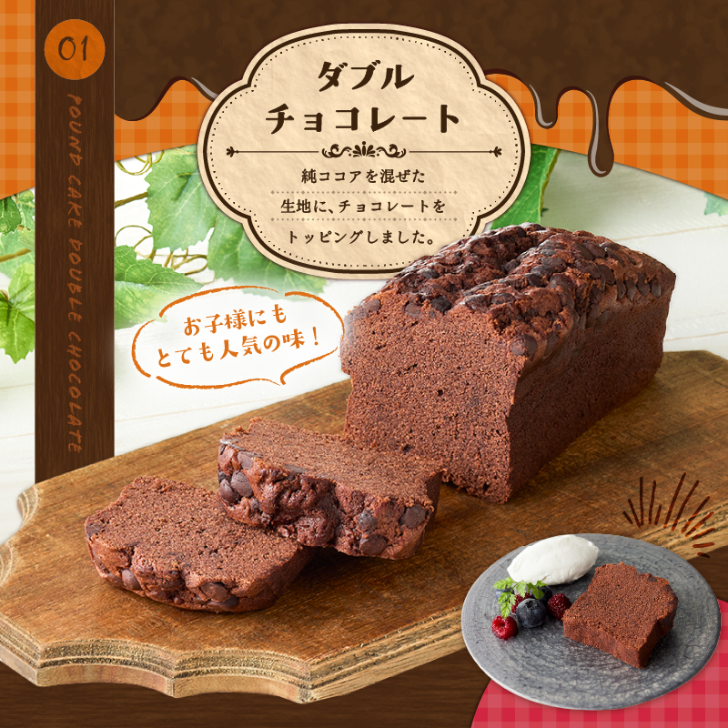 ●ダブルチョコレート:純ココアを混ぜた生地に、チョコレートをトッピングした子供に人気のケーキ