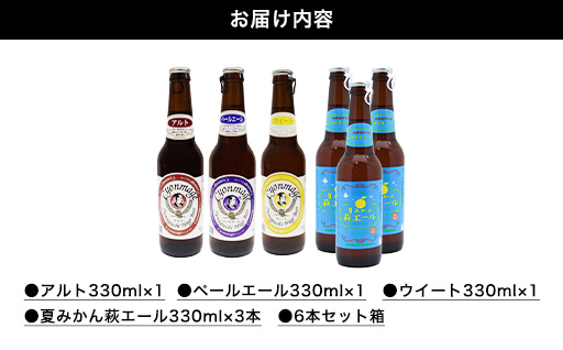 夏みかん萩エール3本と定番の3種類を各1本ずつの、4種・6本セットです。