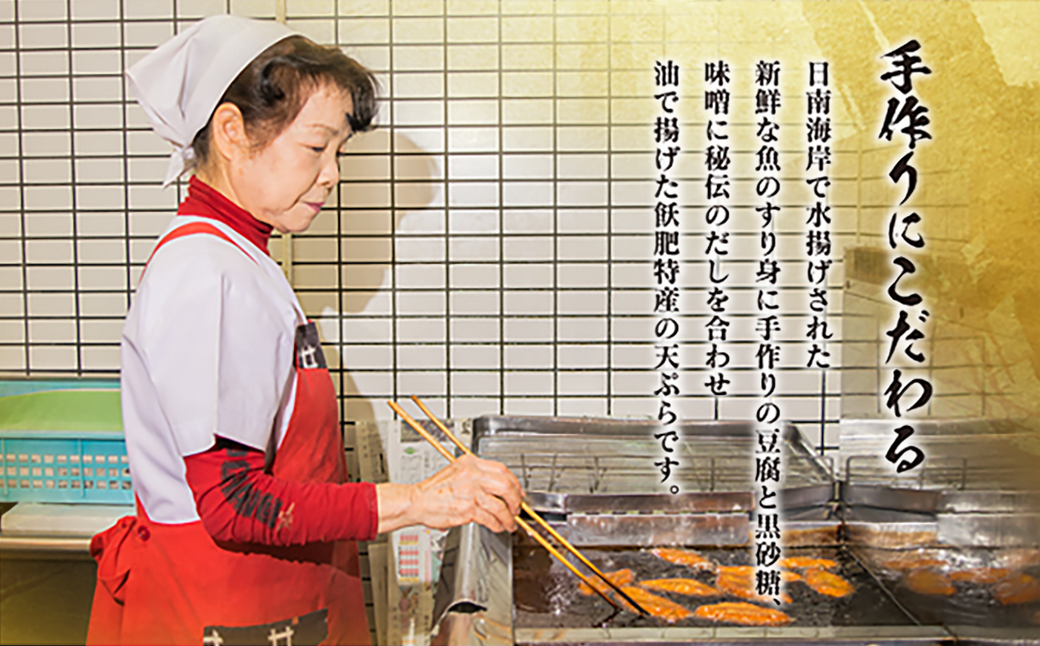 日南海岸で水揚げされた新鮮な魚のすり身に手作りの豆腐と黒砂糖、味噌に秘伝のだしを合わせ油でふんわり揚げた飫肥特産の天ぷらです。