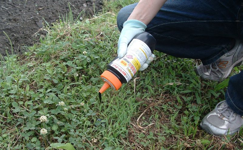 「金太郎 忌避王」は、作物を植えられる前から土の上に2m間隔で散布していただき、嫌な臭いのする場所を作ることによって侵入を防ぐ臭いのする液です。植えられる前の早い時期、実のなる時期、収穫時期等に数回撒かれることをお薦めします。