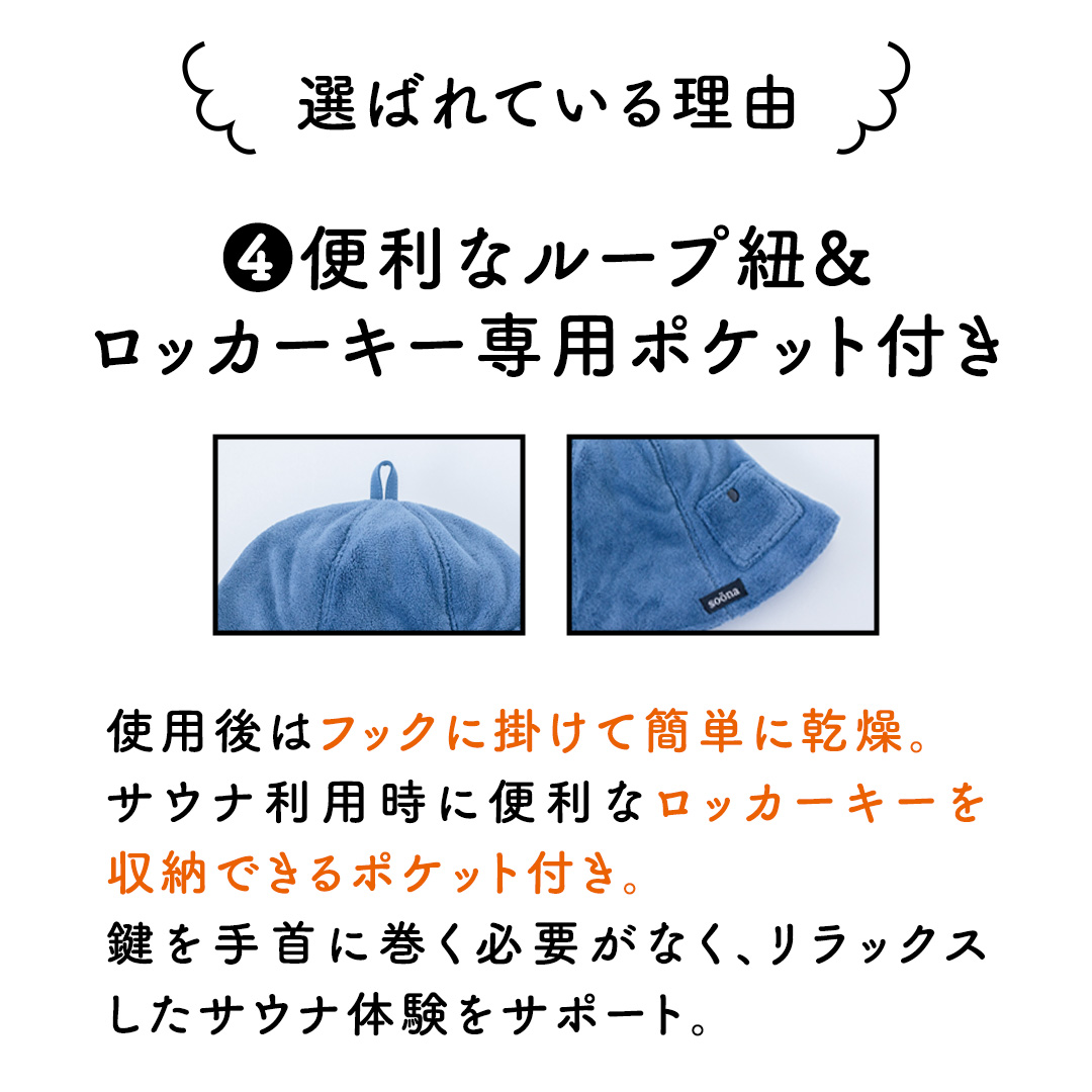 さらに、ループ紐付きで乾かしやすく、ロッカーキーを収納できるポケット付き。サウナ利用時の利便性を高めた実用的なデザインです。