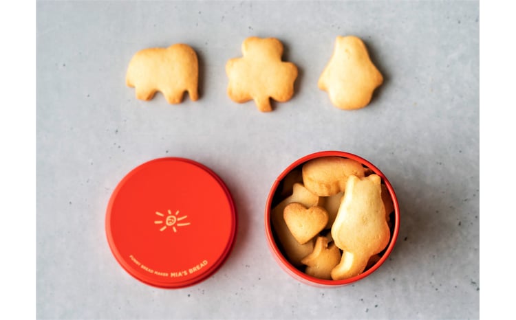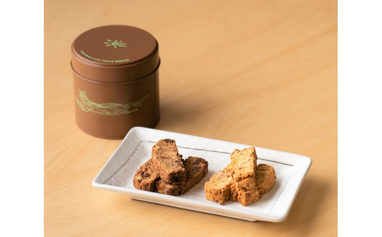 缶は、食べ終わった後にも使える猫のイラストの入ったミアズブレッド特注です。パン屋がつくるサブレとビスコッティのセットは、甘味や油を極力抑えた、年齢問わず安心して召し上がれるスイーツです。