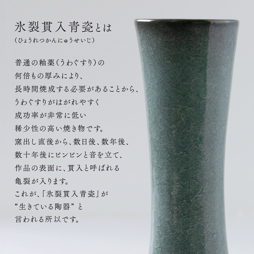 「氷裂貫入青瓷」は、青瓷(せいじ)の一種で、氷が割れたような模様が美しさを際立てる逸品です。
