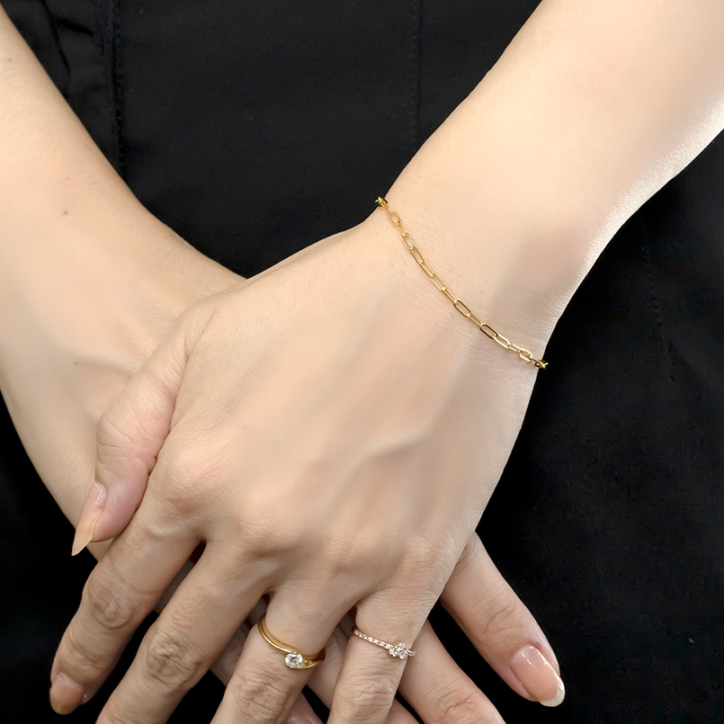 地金の素材感とスタイリッシュに見せるサイズ感で、ワンランク上のチェーンブレスレットです。