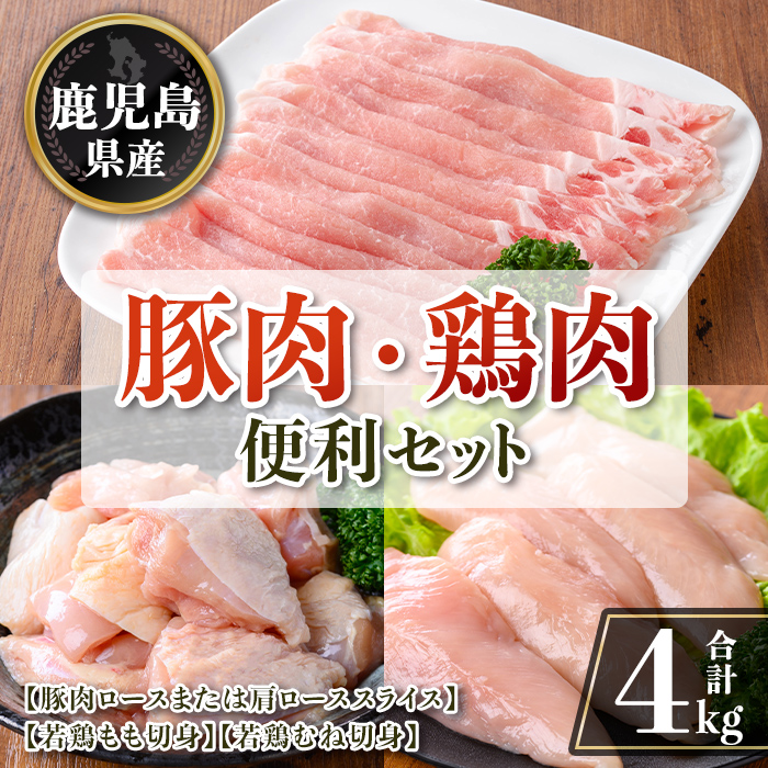 鹿児島県産豚肉のロース又は肩ローススライス&カット済の鹿児島県産鶏もも肉、むね肉を総重量4kgをお届けします。