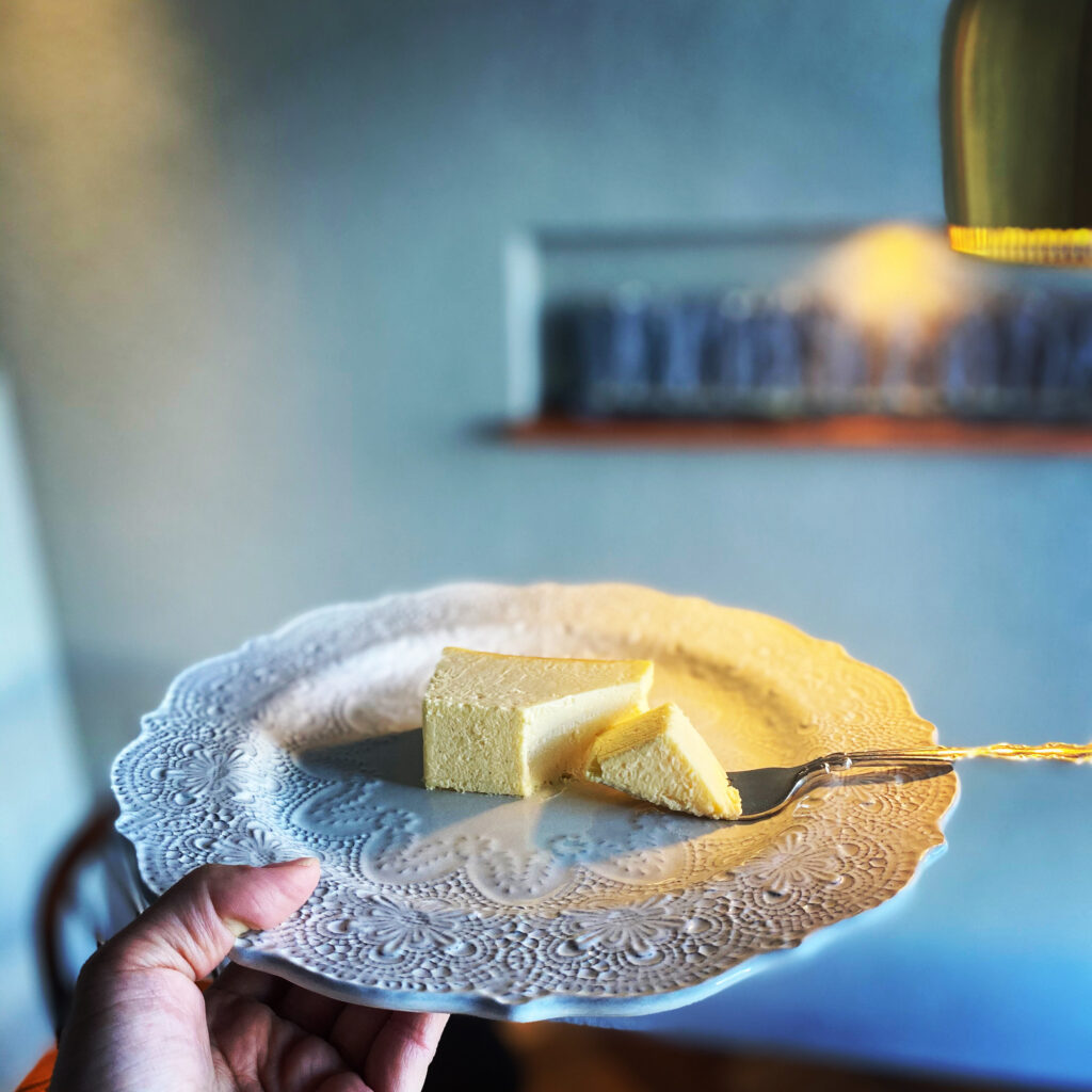 生クリームを限りなく少なくし、チーズの良い香りを消さないように、あえてレモン一切使っていません。味わいのバランスで必要な酸味も酸味が特徴的なチーズを使用しております。チーズの香りをしっかりと感じた後、バニラの香りがフワッと香ります。