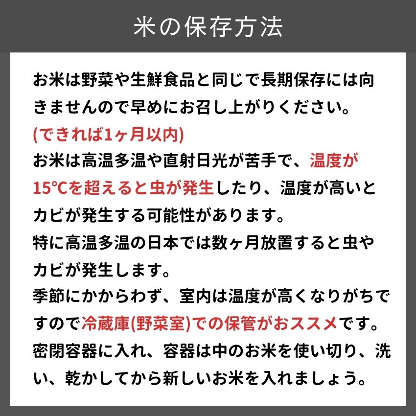 ※ 保管状況次第では米虫が発生することがありますので、15℃以下の涼しい場所で密閉容器等を用いて保存するようお願いします。