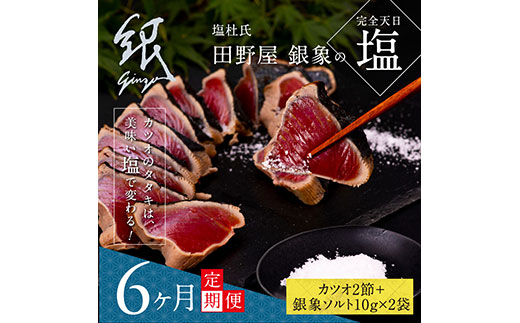 〈カツオのたたき×2節(鰹の大きさには個体差があり、1節約320g360g以上でお送り致します。)、田野屋銀象 天日塩10g×2袋、たたきのタレ15ml×2袋、おろしニンニク2g×2袋〉×6ヵ月